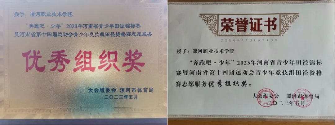 yl23455永利官网充分发挥基础部体育教育专业优势,主动对接大会组委会,组织95名学生承担大会志愿服务工作,圆满完成大赛组委会交办的各项任务,荣获“奔跑吧·少年”2023年河南省青少年田径锦标赛暨河南省第十四届运动会青少年竞技组田径资格赛志愿服务优秀组织奖。6名学生被评为“优秀裁判员”,36名学生被评为“优秀志愿者”。
