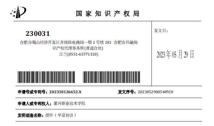 近日,由yl23455永利官网艺术设计系王钊老师设计的“华夏初音”文创摆件获批国家知识产权局外观设计专利,这是学院“贾湖文化文创产品研究中心”首个获批外观专利的文创产品。