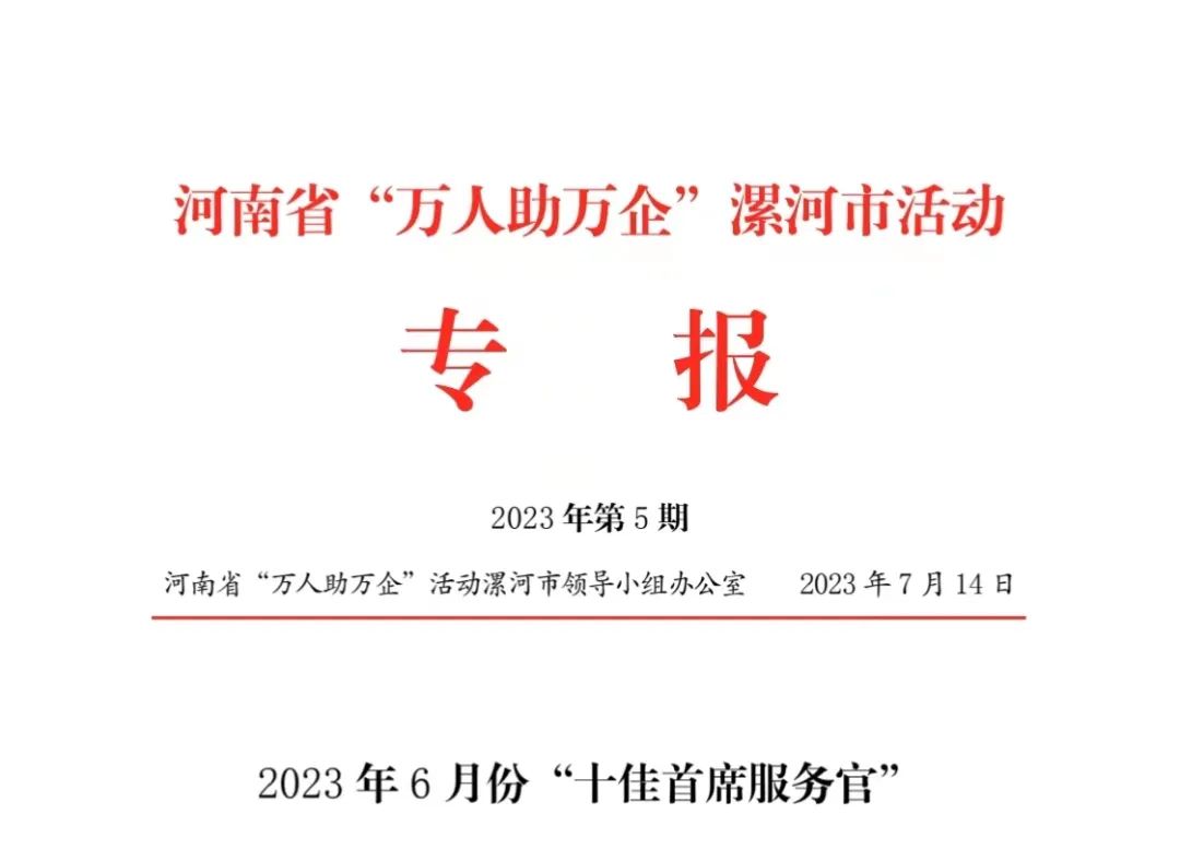 近日,河南省“万人助万企“活动”漯河市领导小组办公室发布专报,yl23455永利官网首席服务官、党委委员、纪委书记李兆强入选6月份“十佳首席服务官”。