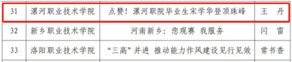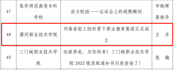 经学校申报推荐、专家组集中评审等程序,我校在此次评选中荣获“河南高校2022—2023年度宣传先进单位名单(卓越奖)”;学校新闻作品《点赞!漯河职院毕业生宋学华登顶珠峰》、《河南省轻工纺织骨干职业教育集团正式成立》分获河南高校2022—2023年度优秀新闻作品一、三等奖;党委组宣部杨琦老师被评为优秀通讯员。