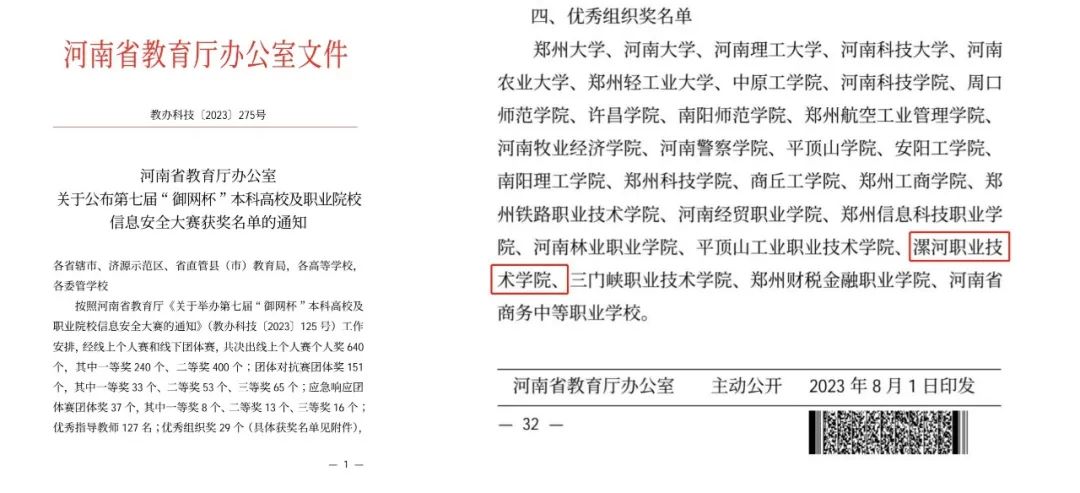 近日,河南省教育厅办公室下发《关于公布第七届“御网杯”本科高校及职业院校信息安全大赛获奖名单的通知》(教办科技〔2023〕275号),学院68名参赛选手在线上个人挑战赛赛项中荣获三等奖,yl23455永利官网荣获“优秀组织奖”。
