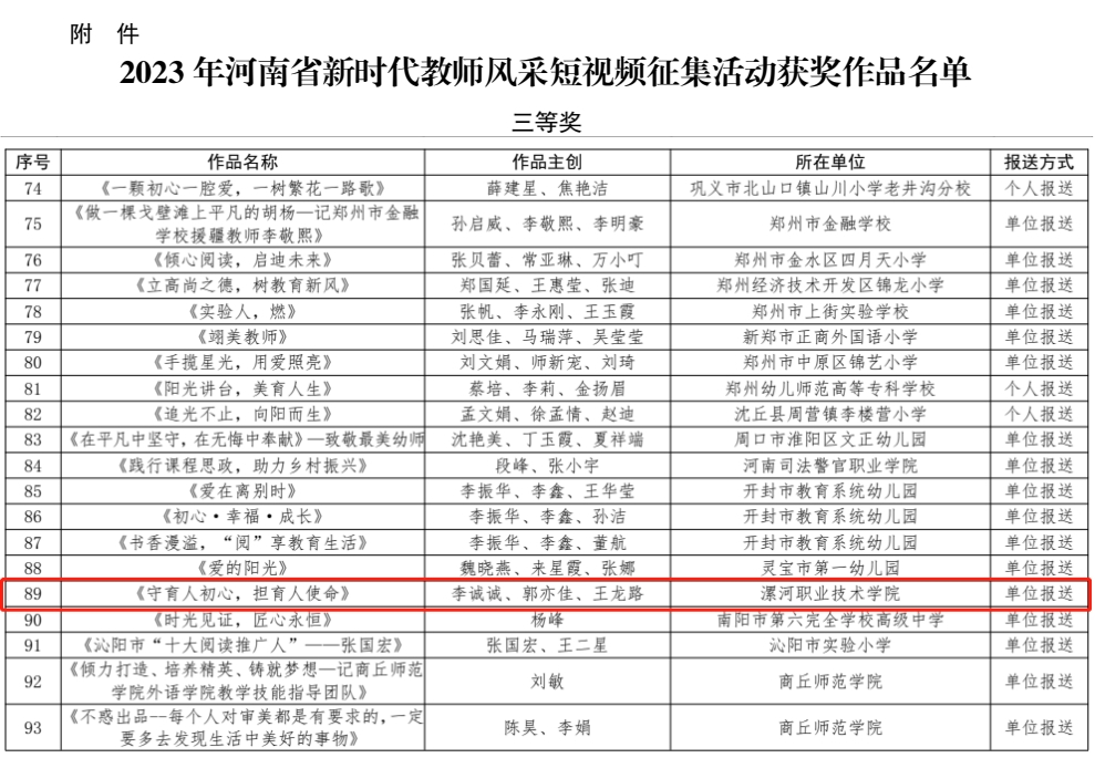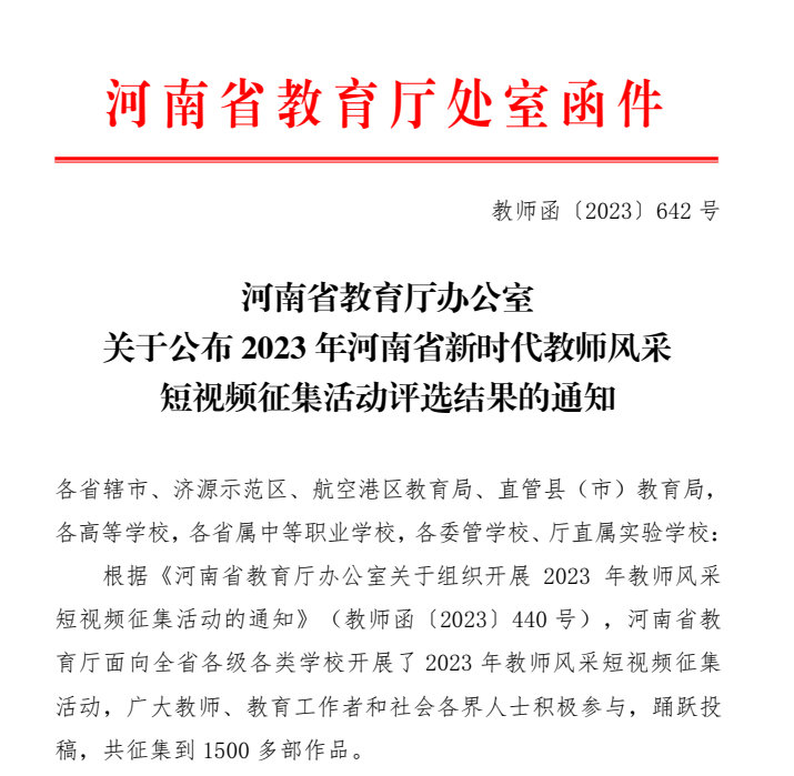 近日,河南省教育厅办公室下发《关于公布2023年河南省新时代教师风采短视频征集活动评选结果的通知》,yl23455永利官网报送作品《守育人初心,担育人使命》荣获三等奖。