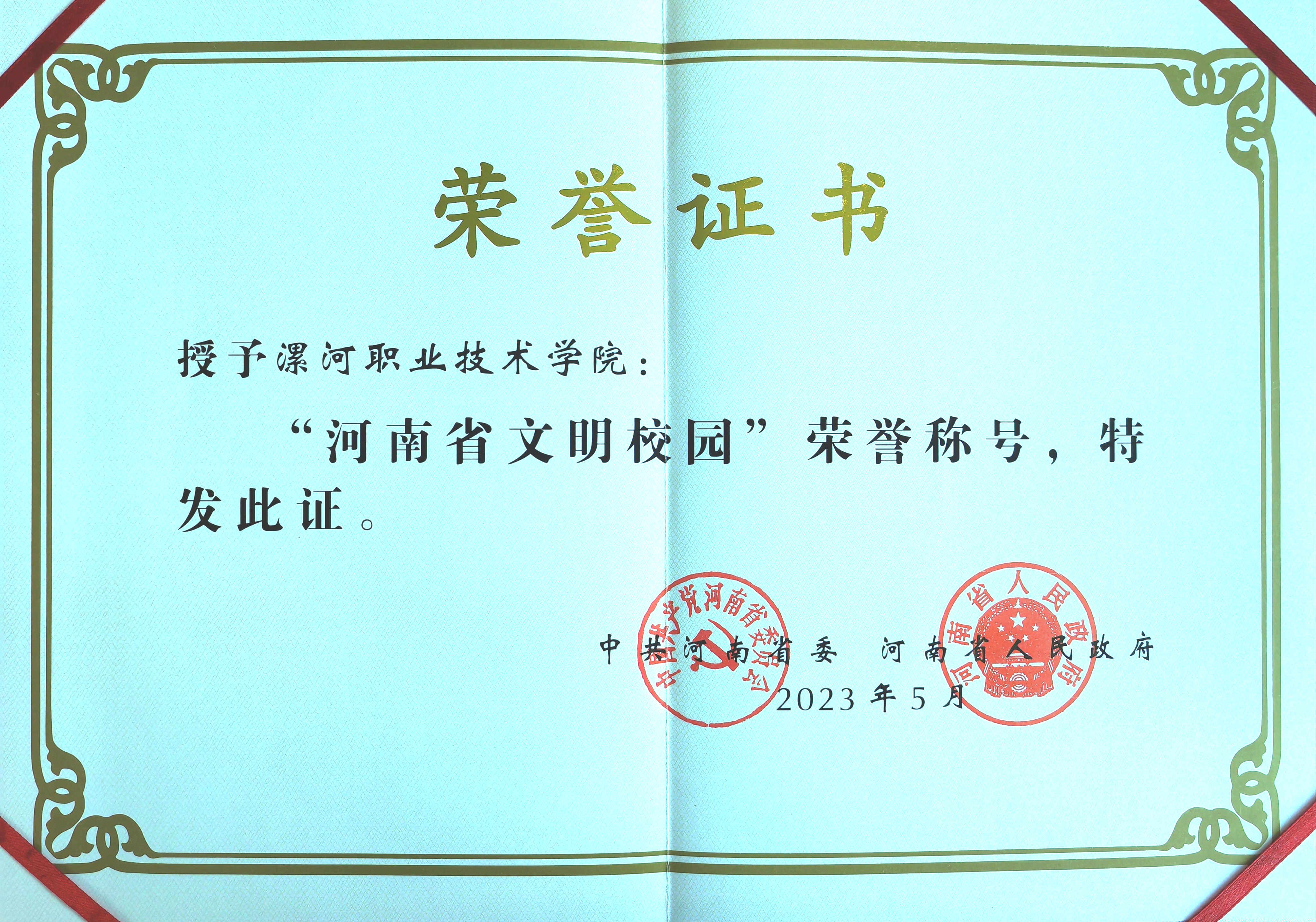 近日,中共河南省委、河南省人民政府印发《关于命名新一届河南省文明城市文明村镇文明单位文明家庭的决定》(豫文〔2023〕50号),yl23455永利官网再次被授予“河南省文明校园”荣誉称号。