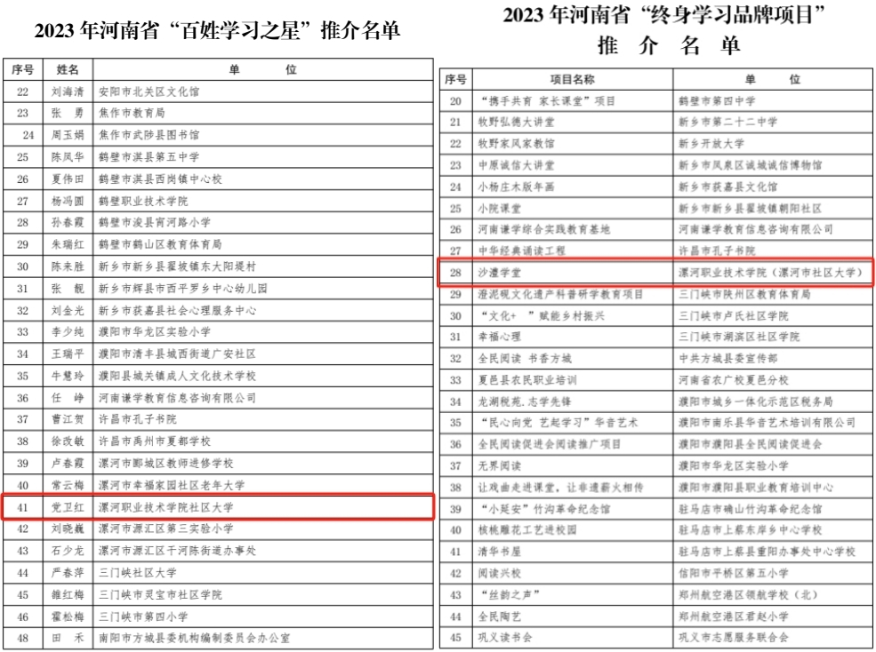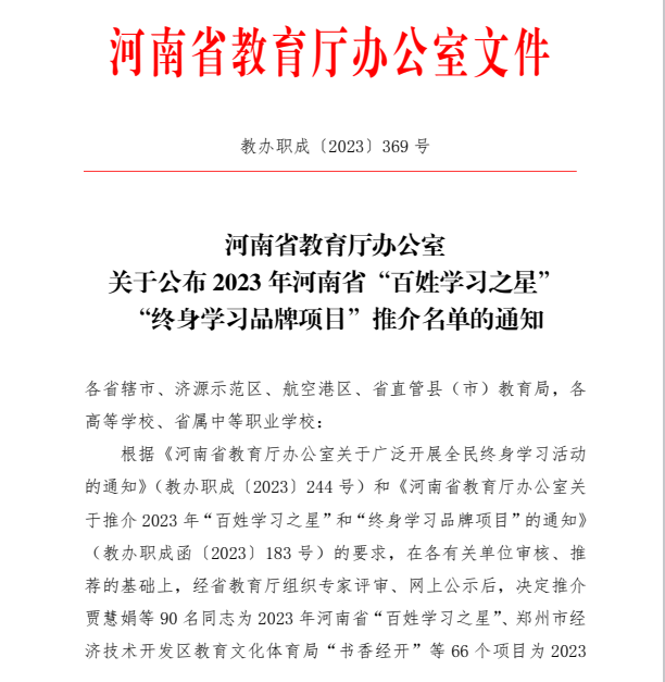 近日,河南省教育厅办公室下发《关于公布2023年河南省“百姓学习之星”和“终身学习品牌项目”推介名单的通知》,经学院审核、推荐,省教育厅专家评审、公示,yl23455永利官网党卫红老师荣获“百姓学习之星”推介,学院推荐的作品《沙澧学堂》荣获“终身学习品牌项目”推介。