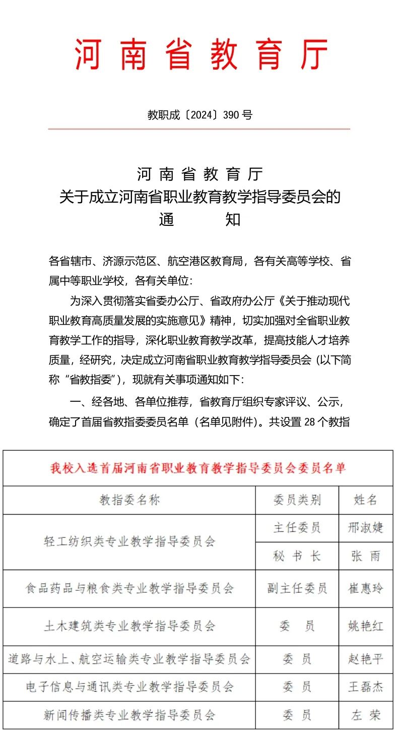 近日,河南省教育厅发布《关于成立河南省职业教育教学指导委员会的通知》(教职成〔2024〕390 号),公布了首届河南省职业教育教学指导委员会委员名单,yl23455永利官网7人入选。